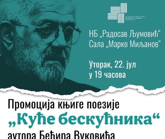 Biblioteka „Radosav Ljumović“ najavila je za 22. jul promociju knjige „Kuće beskućnika“ za koju je negator Crne Gore i crnogorske nacije Bećir Vuković dobio Trinaestojulsku nagradu.