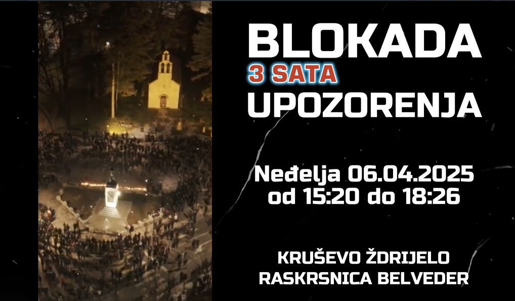 - Ovim putem obavještavamo građane i cjelokupnu crnogorsku javnost da ćemo u nedjelju, 6. aprila, na raskrsnici na Kruševom Ždrijelu, organizovati „Blokadu upozorenja“ u trajanju od tri sata, tačnije od 15:20 do 18:26- navode oni.