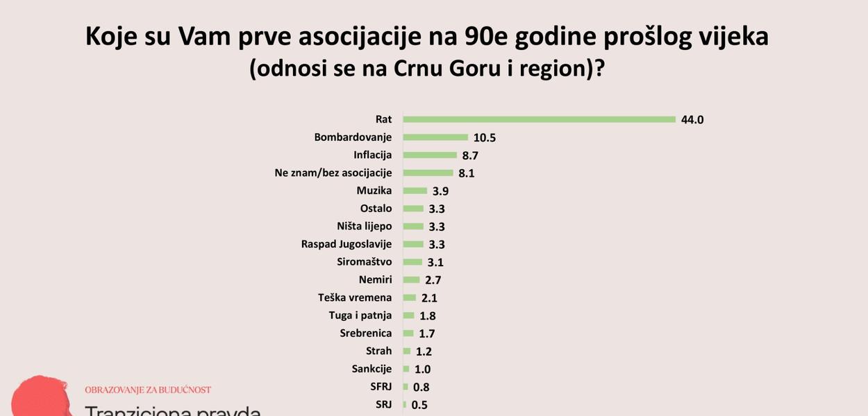 Dominantno su negativne asocijacije na devedesete, a najčešće uključuju rat (44 odsto), bombardovanje (10,5 odsto) i inflaciju (8,7 odsto), dok je muzika (3,9 odsto) rijetka pozitivna asocijacija na taj period, podaci su istraživanja Centra za građansko obrazovanje (CGO).