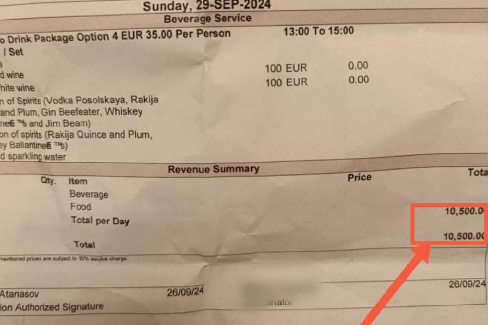 Srpska pravoslavna crkva je za dvosatni ručak u eksluzivnom hotelu Regent u Porto Montenegru platila 10.500 eura, pokazuje račun tog hotela koji je objavljen na društvenoj mreži X.