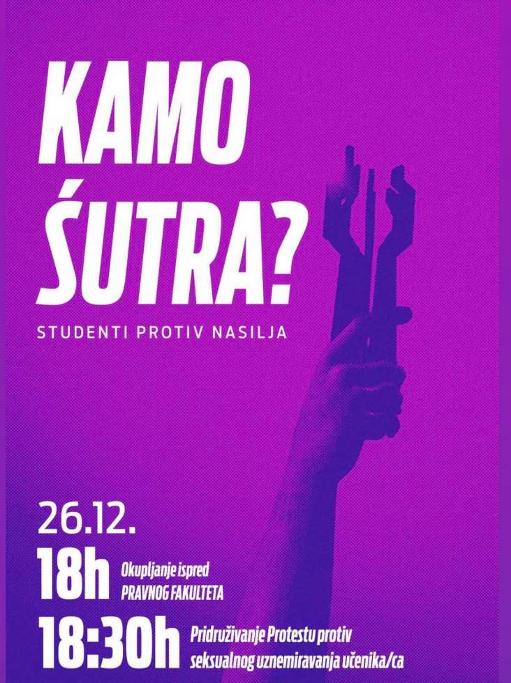 Najavljeno je da će u 18 sati i 30 minuta studenti prošetati od Pravnog fakulteta preko Moskovskog mosta, pa do spomenika kralju Nikoli, na Bulevaru Svetog Petra Cetinjskog, gdje će se pridružiti protestu protiv seksualnog uznemiravanja.