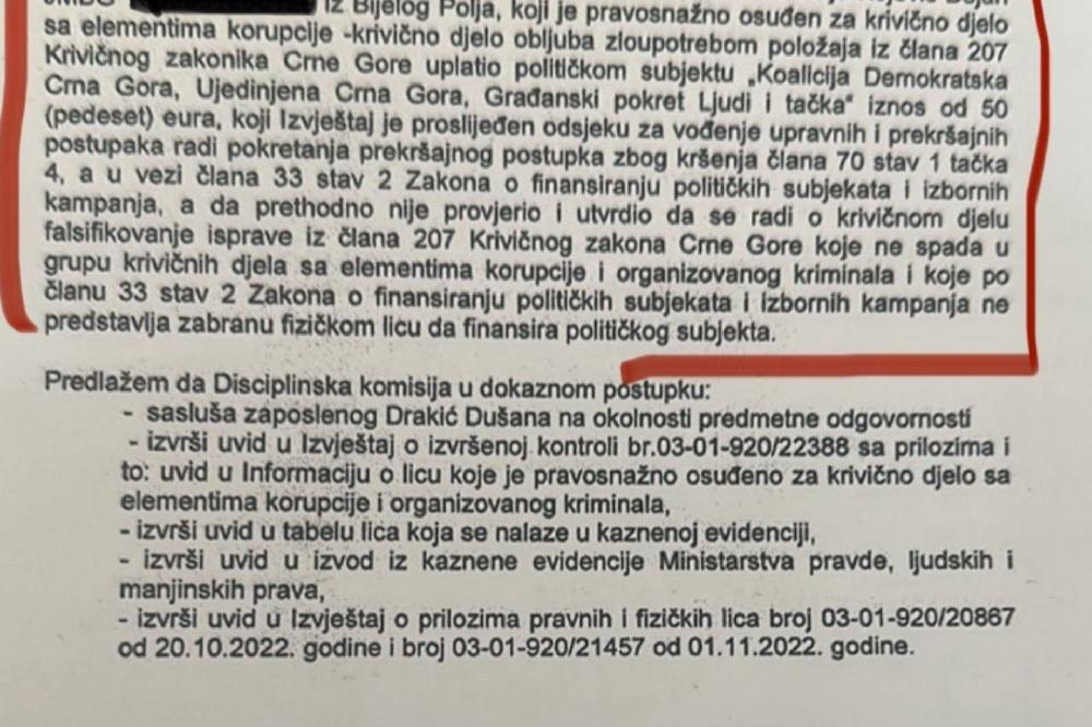 Mladen Tomović svjesno je prikrio da tadašnja driektorica ASK-a Jelena Perović nije suspendovala Dušana Drakića zbog svog sindikalnog angažmana nego zato što je – kao načelnik Odsjeka za sprovođenje mjera kontrole finansiranja političkih subjekata i političkih kampanja – netačno naveo opis krivičnog djela građanina D.K. iz Bijelog Polja (identitet poznat redakciji) određujući mu kaznu od 50 eura zbog nezakonite uplate ,,Koaliciji Demokratska Crna Gora, Ujedinjena Crna Gora, Građanski pokret ‘Ljudi i tačka’”