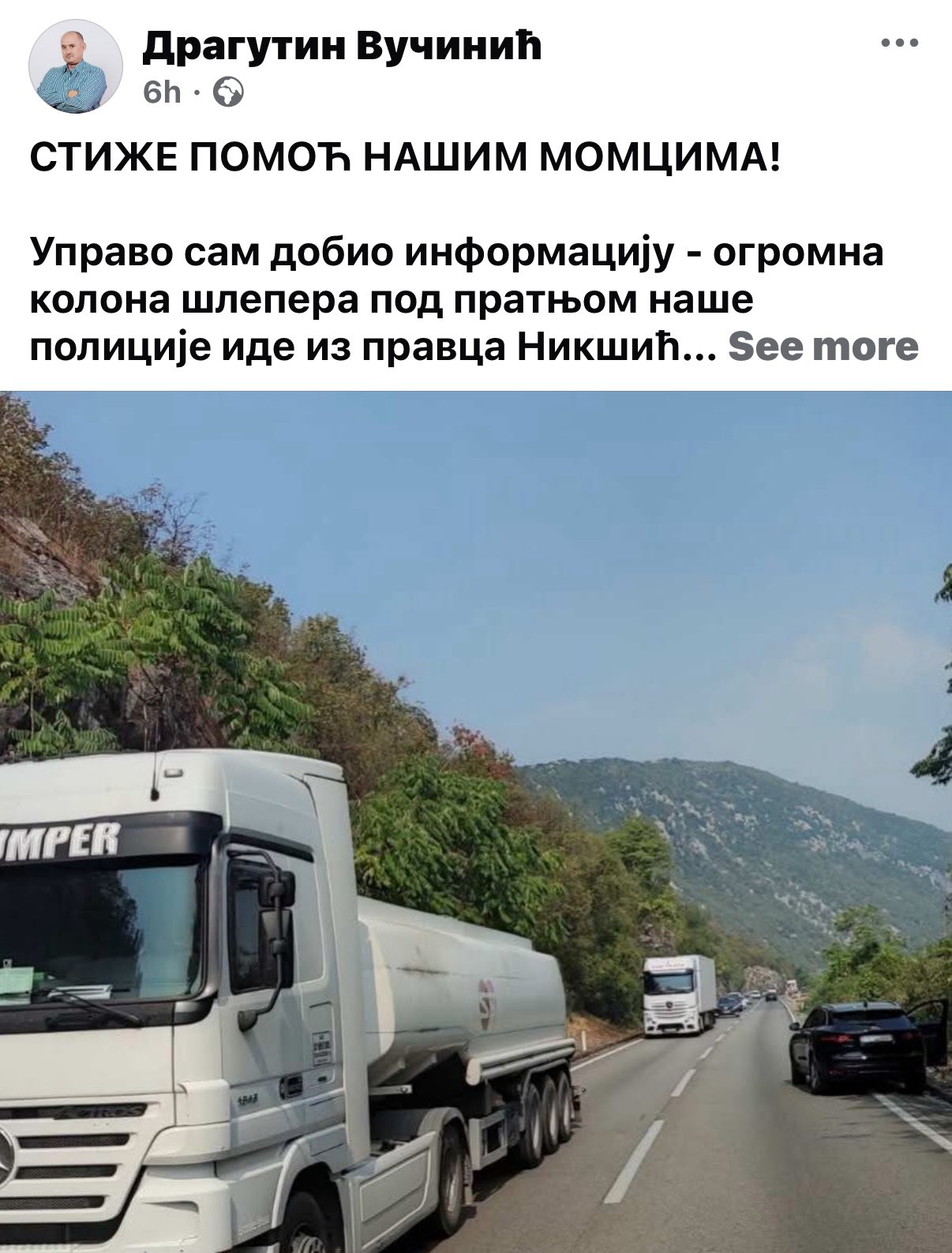 Upravo sam dobio informaciju – ogromna kolona šlepera pod pratnjom naše policije ide iz pravca Nikšića i Danilovgrada ka Podgorici!