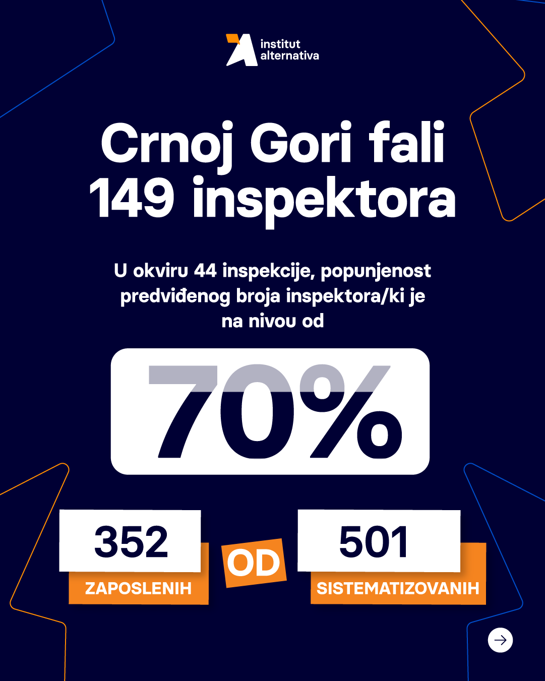 Prema podacima za 44 inspekcije koje djeluju u skladu sa Zakonom o inspekcijskom nadzoru, Crnoj Gori fali 149 inspektora, budući da je sistematizacijom predviđen 501 inspektor/ka (uključujući i glavne inspektore i inspektore koordinatore), dok je zaposleno svega njih 352 (70.26 odsto). U ovaj podatak se ne ubrajaju poreski, carinski i pravosudni inspektori, koji sprovode nadzore u skladu sa svojim matičnim zakonima, rezultati su istraživanja koje je sproveo Institut Alternativa.