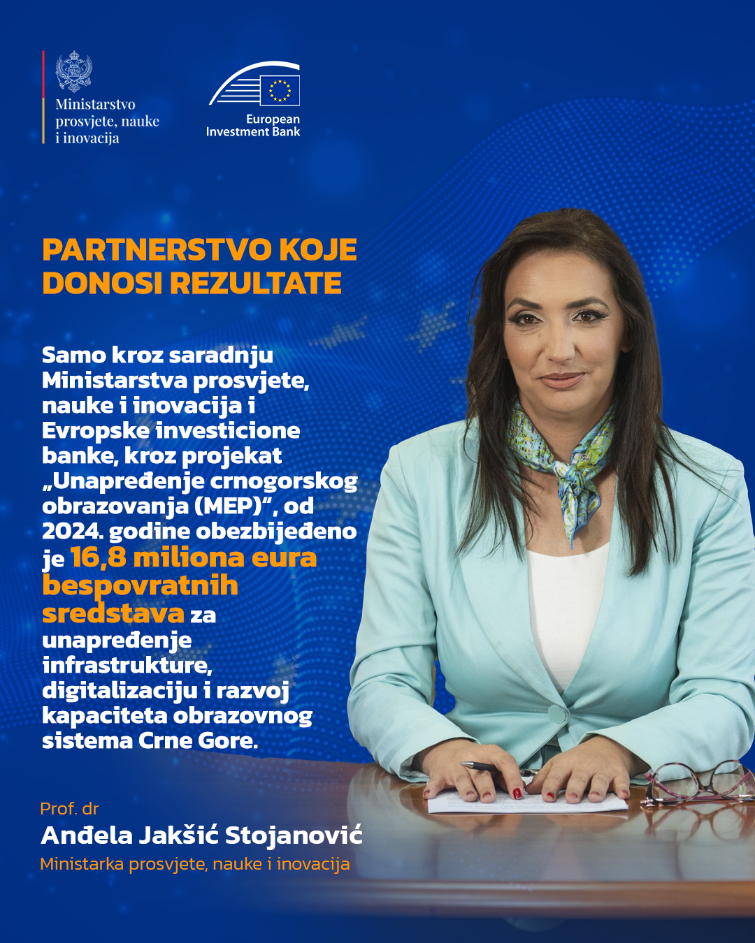Ministarstvo prosvjete, nauke i inovacija (MPNI) od 2024. godine u saradnji sa Evropskom investicionom bankom (EIB) na realizaciji projekta "Unapređenje crnogoskog obrazovanja /Montenegro education project/ " (MEP) obezbijedilo je 16,8 miliona eura bespovratnog novca, kazala je ministarka Anđela Jakšić Stojanović.