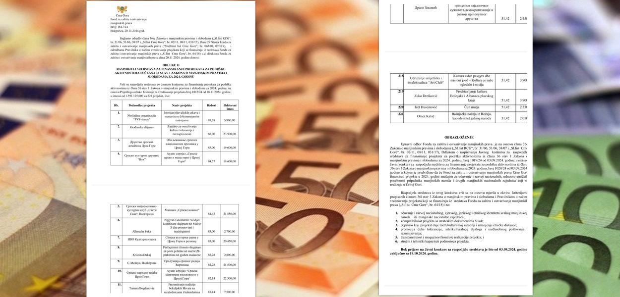 Objavili smo da je organizacija Društvo srpskih domaćina dobila čak 19.600 eura za projekat „Obilježavanje srpskih nacionalnih praznika u Crnoj Gori“, koliko je pripalo i Srpskom kulturnom društvu „Vuk“ za projekat – Audio serijal „Srpske crkve i manastiri u Crnoj Gori“. Srpski kulturno-informativni klub „Sveti Sava“ Podgorica dobio je 21.550 eura za projekat Magazin „Srpske novine“, dok je NVO Kulturna scena za projekat Srpska kulturna scena u Crnoj Gori i regionu dobila 20.450 eura. Organizacija S-Mediji Podgorica dobila je 21.500 eura za projekat Produkcija srpskog radija „Ćirilica“, a Srpsko narodno vijeće dobilo je 22.500 eura za audio serijal „Srpska savremena književnost u Crnoj Gori“. NVO „Bisernica“ dobila je 22.400 eura za projekat „Manifestacija srpskih pjevačkih društava“, a Srpska književna zadruga u Crnoj Gori - 21.550 za izdavačku djelatnost. Konferenciji srpskih nacionalnih organizacija iz zemalja regiona, Podgorica pripalo je 20.000 eura za akademske tribine...