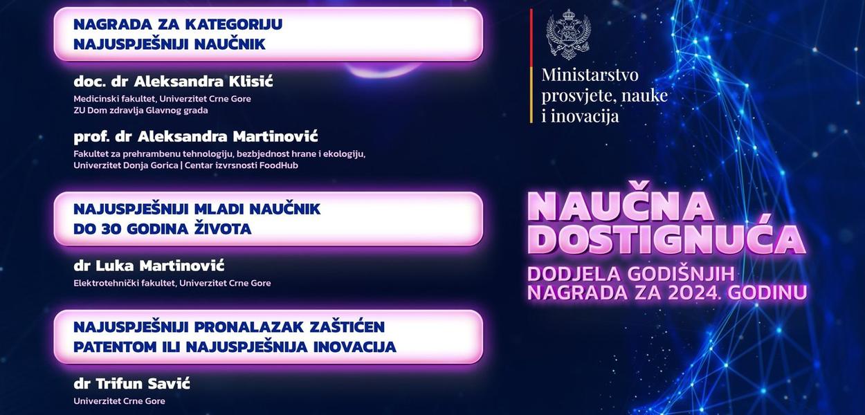 Dobitnice nagrada za naučna dostignuća u prošloj godini su Aleksandra Klisić i Aleksandra Martinović, saopšteno je iz Ministarstva prosvjete, nauke i inovacija.