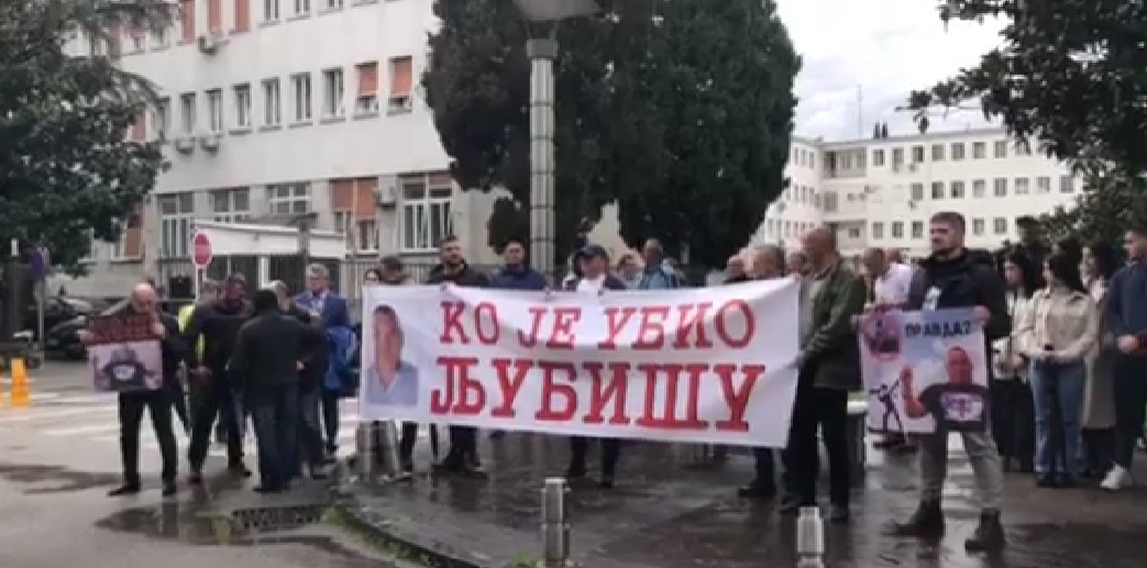 Ispred zgrade Višeg suda u Podgorici u toku je protest grupe građana, članova porodice i prijatelja ubijenog Ljubiše Mrdaka tokom pljačke Pošte 20. oktobra 2021. godine u Nikšiću.
