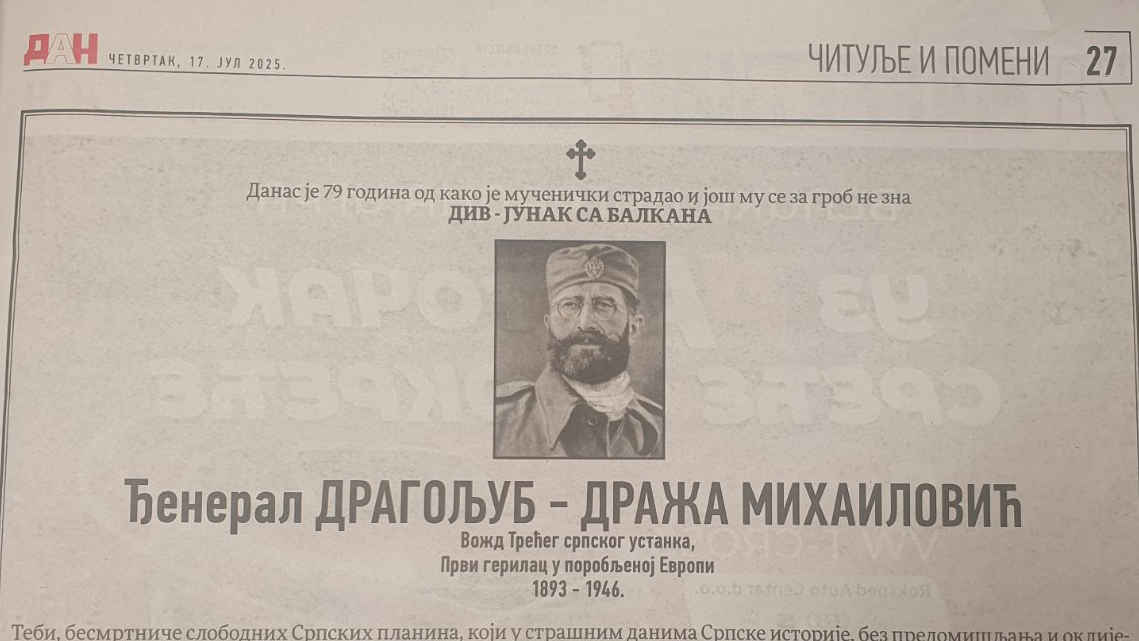 Na današnji dan navršava se 79 godina od pogubljenja Dragoljuba Draže Mihailovića, komandanta četničkog pokreta u Drugom svjetskom ratu, koji je 1946. osuđen na smrt zbog saradnje s okupatorom i ratnih zločina. Tim povodom, u rubrici „Čitulje i pomeni“ dnevnog lista „Dan“, objavljena su dva oglasa u kojima je Mihailović predstavljen kao „див – јунак са Балкана“, „први герилац у поробљеној Европи“ i „велики човјек, војник и патриота“.