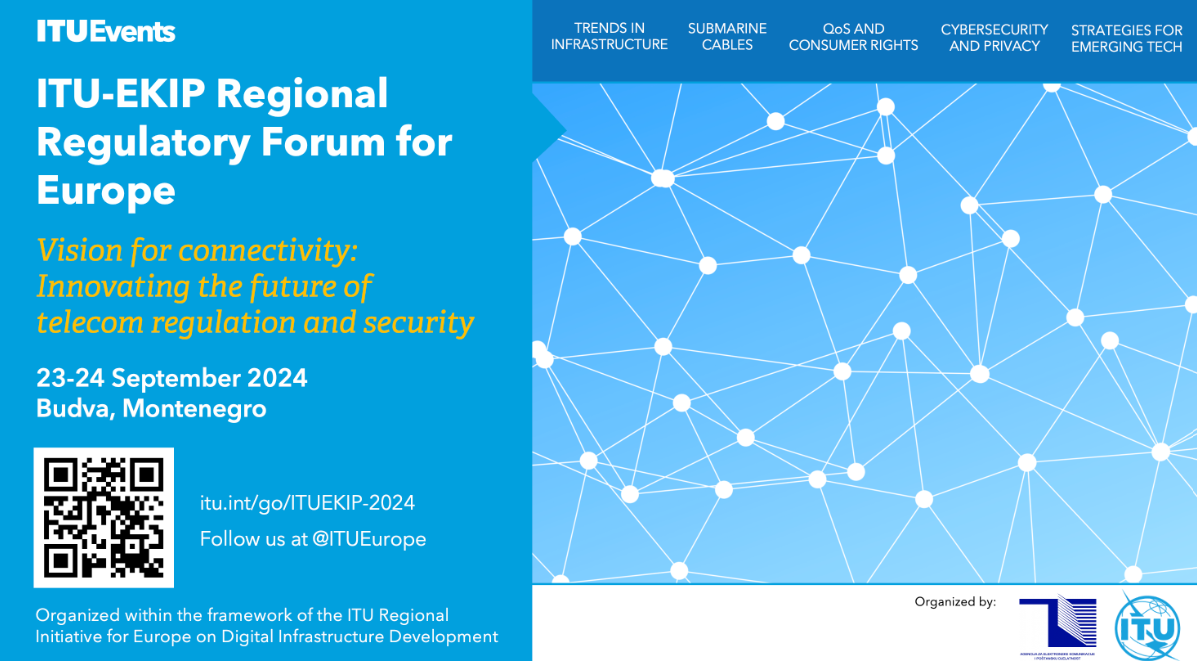Agencija za elektronske komunikacije i poštansku djelatnost (EKIP) u saradnji sa Međunarodnom unijom za telekomunikacije (ITU) organizuje Regionalni regulatorni forum za Evropu 2024, koji će se održati od 23. do 24. septembra u Budvi, na temu „Vizija povezanosti: Inoviranje buduće regulacije i bezbjednosti telekomunikacija“.
