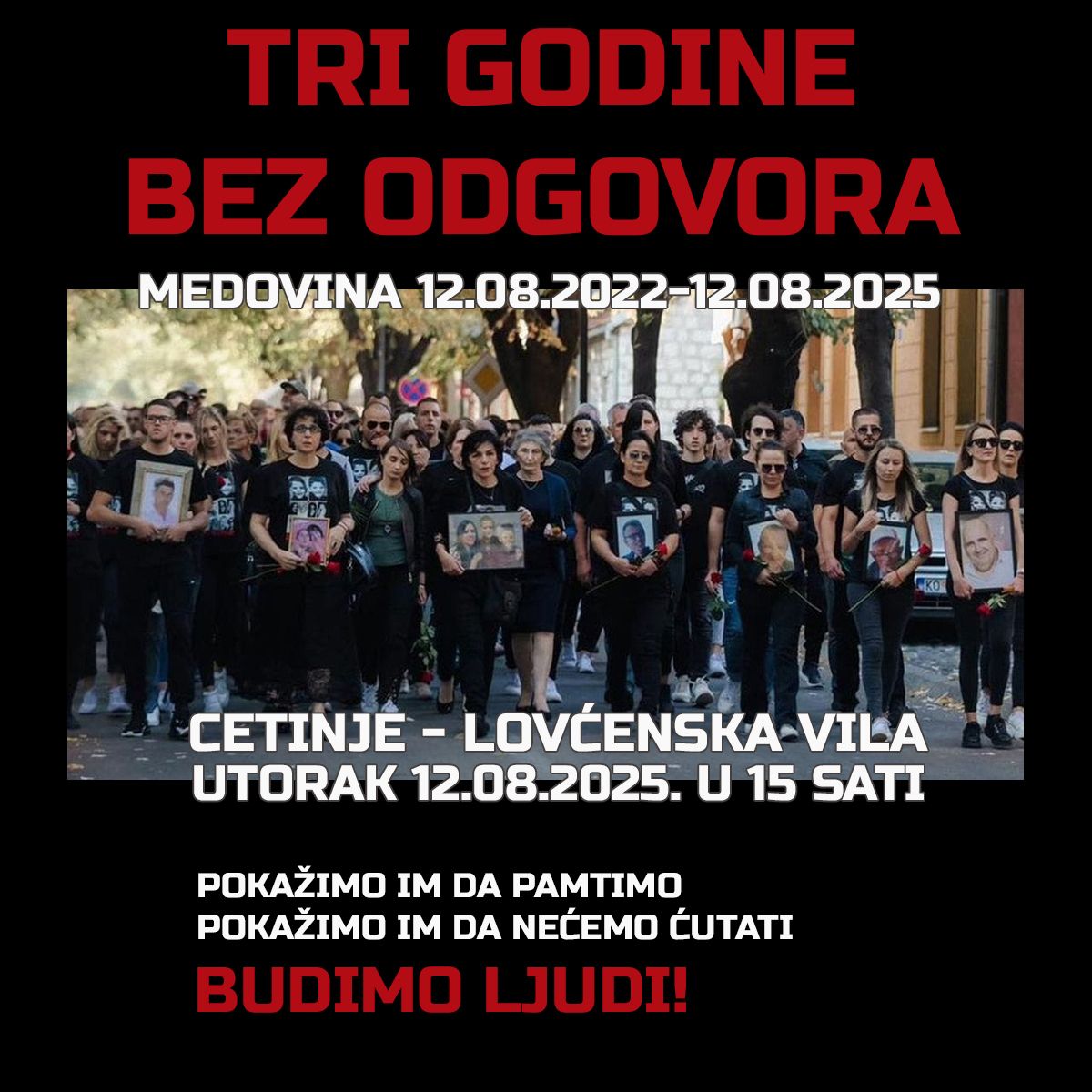 Cetinjani koji na Kruševom ždrijelu mjesecima blokiraju saobraćaj zahtijevajući odgovornost nadležnih za dvije tragedije u kojima je stradalo njihovih 23 sugrađana pozvali su građane Crne Gore da sjutra, 12. avgusta, na treću godišnjicu od kada je u Medovini ubijeno 10 ljudi, dođu ispred Lovćenske Vile kako bi zajedno otišli u to naselje i zapalili za njih svijeće.