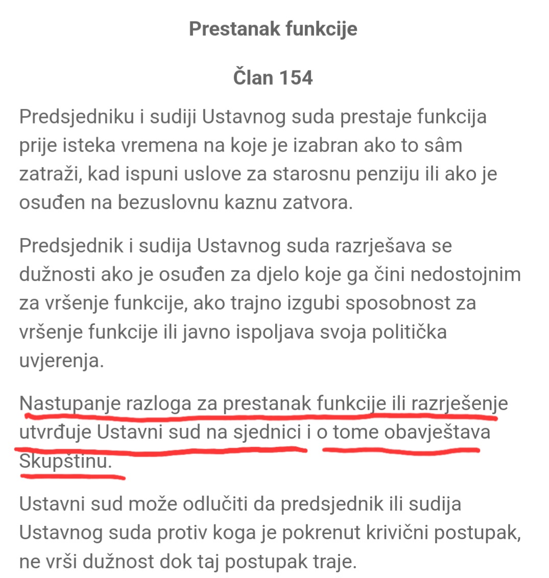 U ovom članu, odnosno stavu navodi se da: "Nastupanje razloga za prestanak funkcije ili razrješenje utvrđuje Ustavni sud na sjednici i o tome obavještava Skuštinu".