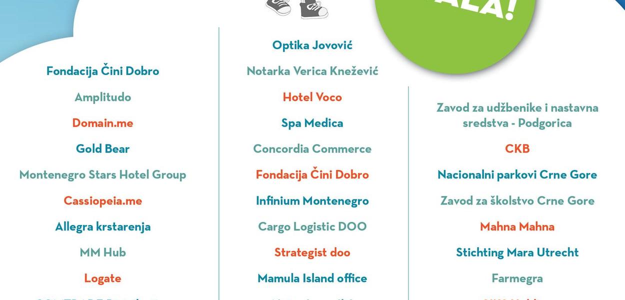 - Posebnu zahvalnost Udruženje duguje partnerima Fondacija “Čini dobro”, koja je donirala 5.500 eura za kupovinu pribora, ali i omogućila sistem za online donacije koji je bio aktivan od 1. do 30. avgusta, kroz koji je obezbijeđeno dodatnih 4.150 eura. Ovi rezultati su postignuti zahvaljujući i podršci kompanija: Amplitudo, Domain.me, Gold Bear, Montenegro Hotel Stars Group, Cassiopeia.me, Allegra krstarenja, MM Hub, Logate, Comtrade Distribution, Igraonica Garfild, Hemosan, Notar Vladan Bekan, Montora Software, Klikloan, Optika Jovović, Notarka Verica Knežević, Hotel Voco, Spa Medica, Concordia Commerce, Infinum Montenegro, Cargo Logistic DOO, Strategist, Mamula Island, Notarka Ivana Ilić, ONE Crna Gora, Qbik, Metropolis Media, Ljetopis Automotive, Unija Smart Accounting, Zavod za udžbenike i nastavna sredstva – Podgorica, CKB banka, Nacionalni parkovi Crne Gore, Zavod za školstvo Crne Gore, Mahna Mahna, Stichting Mara Utrecht, Farmegra, SIKS Holding, We are AI, Agent Plus Bar, Alter Modus, Morsko Dobro - precizirano je u saopštenju.
