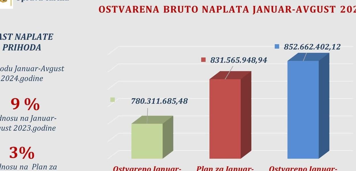 - Ostvarena bruto naplata iznosila je 853 miliona eura , što je za 72 miliona eura, ili devet odsto više u odnosu na isti period prethodne godine, dok je plan prihoda za period januar - avgust 2024. godine premašen za 21 milion eura, odnosno tri odsto - istakli su u saopštenju.