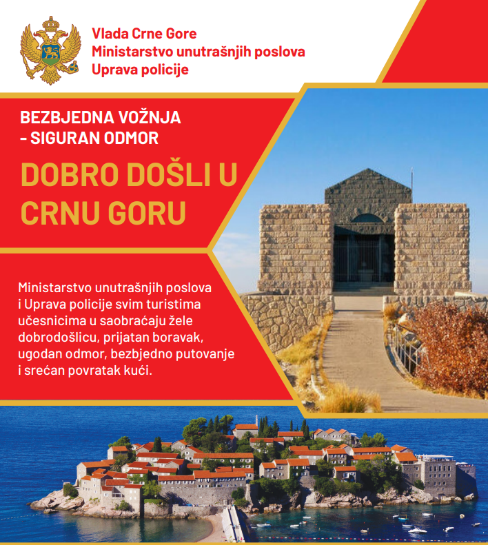 - Kroz edukativno – preventivni flajer Ministarstvo unutrašnjih poslova i Uprava policije, osim dobrodošlice svim turistima koji dolaze u Crnu Goru, ukazuju i na eventualne bezbjednosne rizike u saobraćaju, apeluju i pozivaju sve učesnike u saobraćaju da poštuju zakonske propise, vode računa o ličnoj bezbjednosti, bezbjednosti svojih porodica i ostalih učesnika u saobraćaju, te se savjetuju da na putovanje kreću ispravnim vozilom, odmorni i spremni za vožnju. Kampanja počinje sjutra, a trajaće do kraja ljetnje turističke sezone, odnosno do polovine septembra ove godine - najavili su iz Uprave policije.