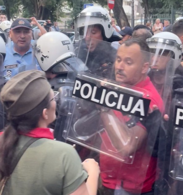 U metežu koji je trajao više sati, pripadnici policije su upotrijebili i biber sprej, a trinaestoro, uglavnom starijih građana, potražilo je medicinsku pomoć. Brutalnost policijske akcije nije, nažalost, izuzetak u Crnoj Gori, pa ni u regionu. Sasvim je moguće da su crnogorski policijski blokaderi prekomjernu upotrebu sile koristili po uzoru na policijske odrede Aleksandra Vučića u Srbiji. Ipak, fotografija čovjeka u crvenoj majici i farmericama, koji drži policijski štit, dio zaštitne opreme - nije do sada viđena. Ni u Crnoj Gori, ni prilikom sličnih policijskih intervencija u regionu. A nije ni mogla biti viđena, jer profesionalna policijska intervencija je jasno kodirana, kao i obaveza nošenja uniforme, Pravilnikom o obavljanju policijskih poslova i primjeni ovlašćenja.