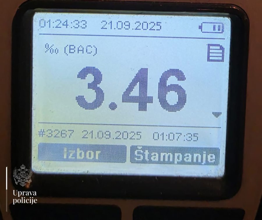 Saobraćajna policija u Baru jutros je oko jedan sat iza pomonoći, u mjestu Bartula, uhapsila vozača M.Š..(31) iz Šavnika jer je upravljao vozilom pod dejstvom alkohola u koncentraciji od 3.46 g/kg u organizmu, objavila je Uprava policije na mreži X.
