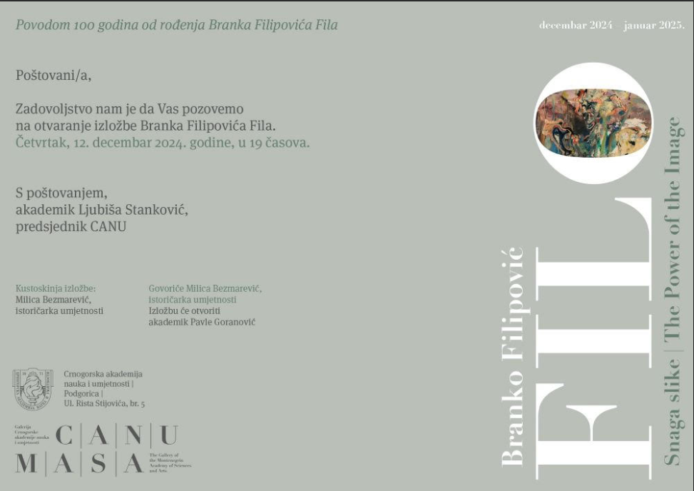 Povodom 100 godina od rođenja velikog umjetnika Branka Filipovića Fila, u četvrtak, 12. decembra, sa početkom u 19 časova, u Crnogorskoj akademiji nauka i umjetnosti biće otvorena izložba njegovih radova.