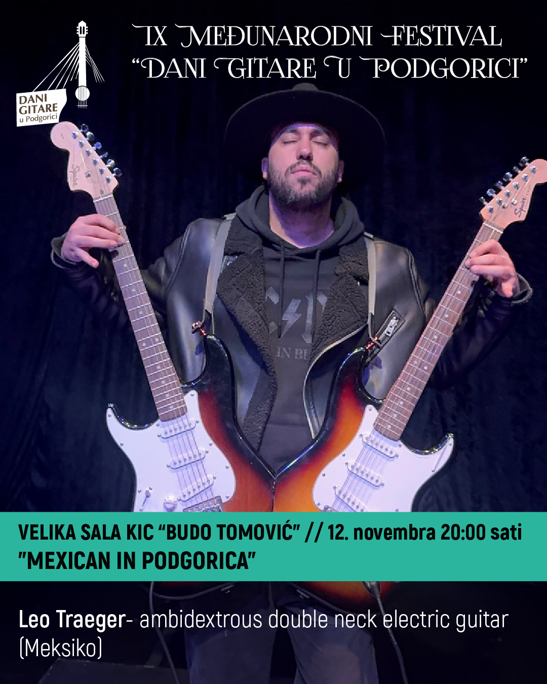 Deveti međunarodni festival „Dani gitare u Podgorici“ počeće koncertom renomiranog multigitariste i kompozitora iz Meksika Lea Traegera u utorak, 12. novembra, u velikoj sali KIC-a „Budo Tomović”, u 20 sati.