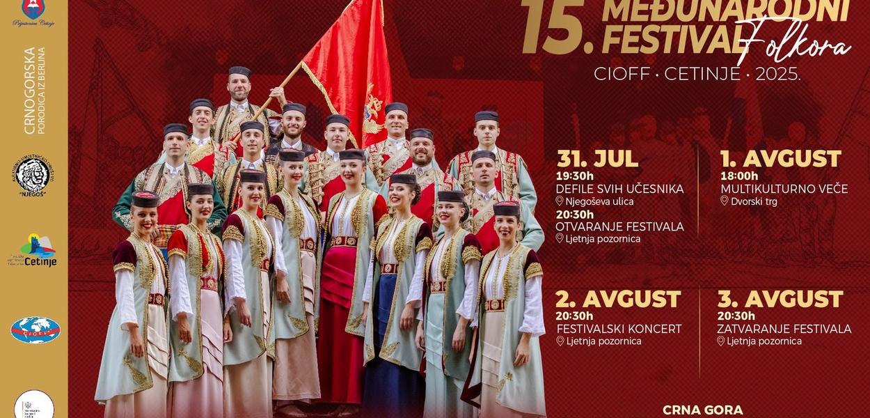 Jubilarni, 15. Međunarodni festival folklora CIOFF „Cetinje 2025“ biće održan od 31. jula do 3. avgusta na Ljetnjoj pozornici i Dvorskom trgu na Cetinju.