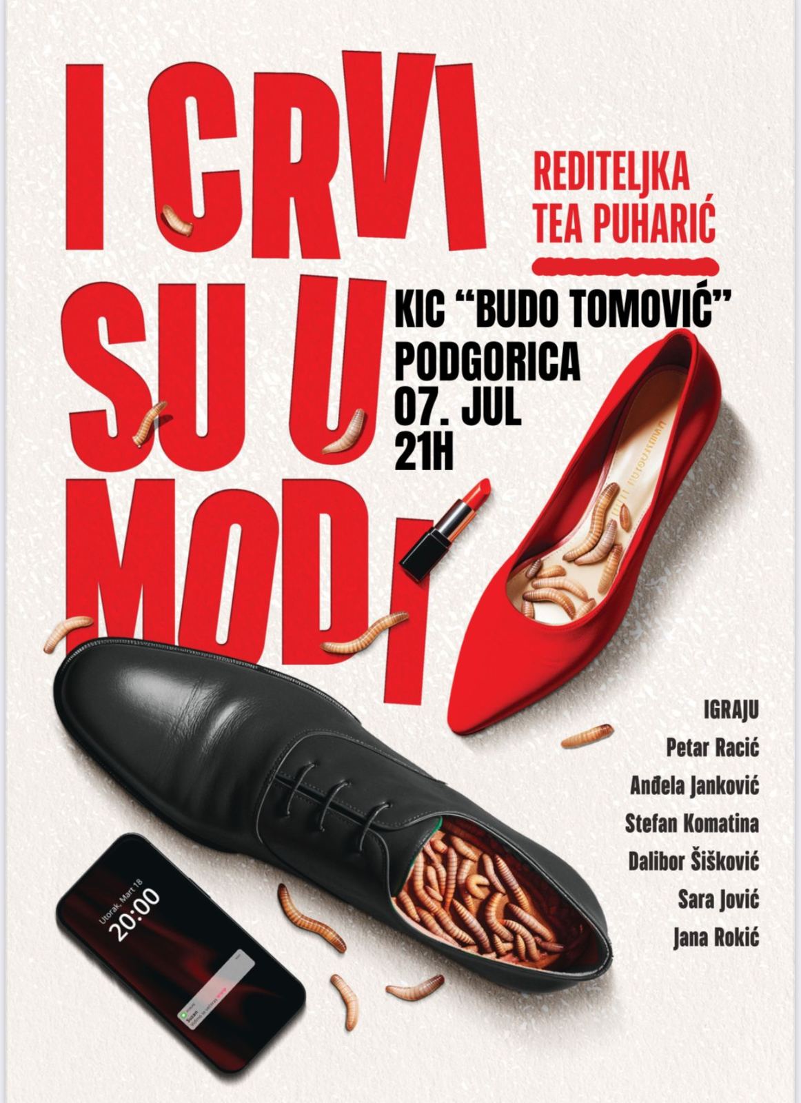 U okviru Podgoričkog kulturnog ljeta, u poneđeljak, 7. jula, u 21 sat, u Velikoj sali KIC-a „Budo Tomović“, biće izvedena predstava „I crvi su u modi“, u režiji Tee Puharić, saoošteno je iz Sekretarijata za kulturu.
