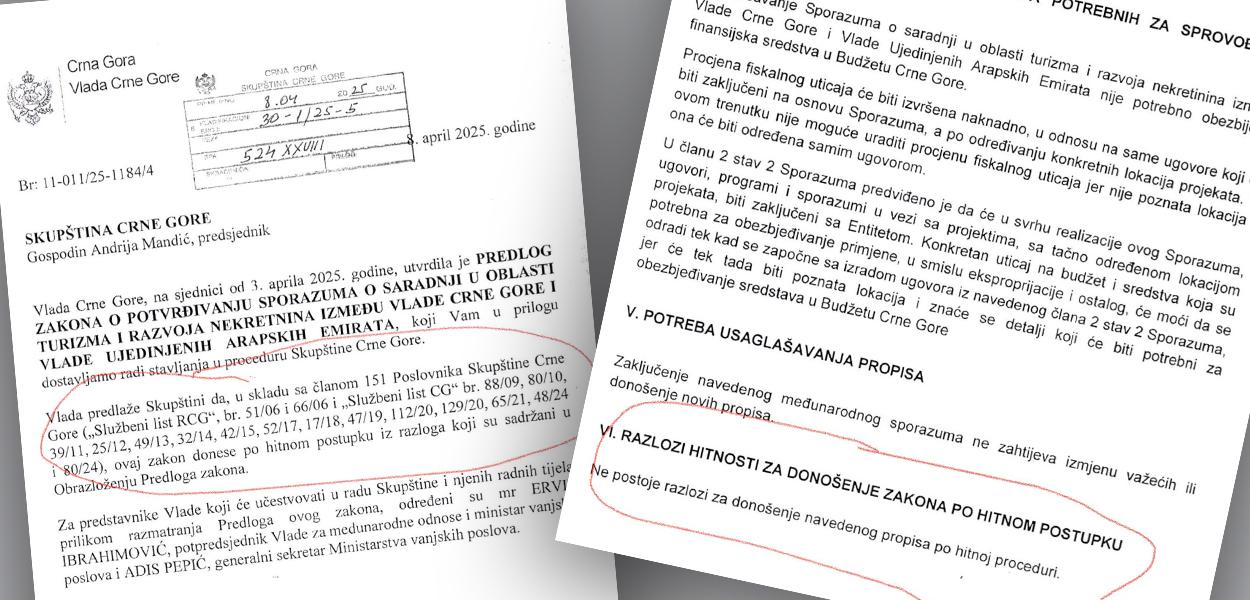 Vlada Crne Gore uputila je danas Skupštini Zakon o potvrđivanju Sporazuma sa Ujedinjenim Arapskim Emiratima o saradnji u oblasti turizma i razvoja nekretnina – po hitnom postupku. Međutim, u obrazloženju koje je sastavni dio predloga zakona navodi se da za hitnu proceduru zapravo ne postoje razlozi.