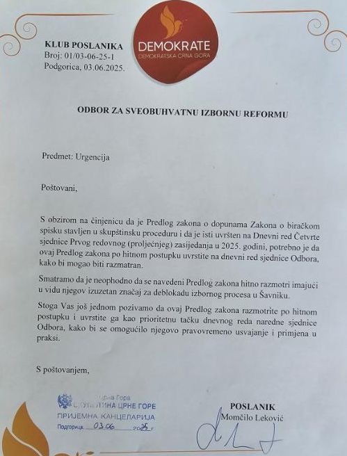 Klub poslanika Demokrata uputio je urgenciju Odboru za sveobuhvatnu izbornu reformu, tražeći hitno razmatranje Prijedloga zakona o dopunama Zakona o biračkom spisku. Kako su saopštili, cilj im je da se o ovom zakonskom rješenju raspravlja što prije, uoči predstojeće sjednice Skupštine.