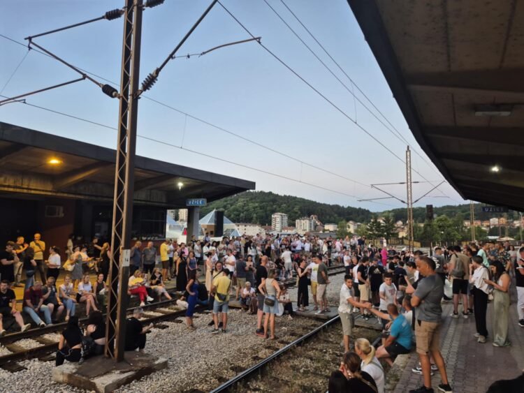 Posle ulične šetnje i skandiranja ispred prostorija Srpske napredne stranke u Užicu, gdje su ispisali grafite i ostavili smeće, Užičani koji su večeras izašli na protest stigli su na željezničku stanicu u tom gradu i blokirali prugu.