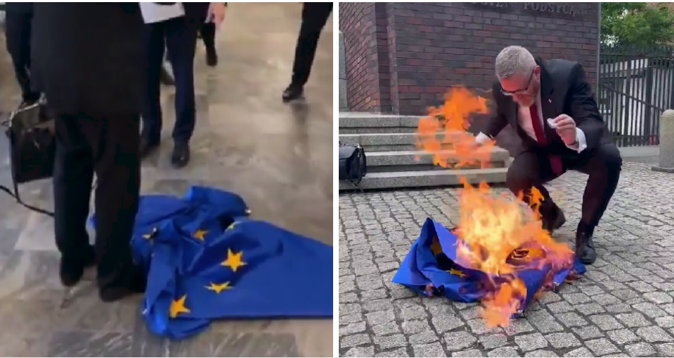 Krajnje desni europarlamentarac i kandidat na predstojećim predsjedničkim izborima u Poljskoj Gžegož Braun spalio je zastavu Evropske unije u zgradi Ministarstva industrije u Katovicama, a prije nego što je zapalio zastavu, obrisao je cipele o nju.