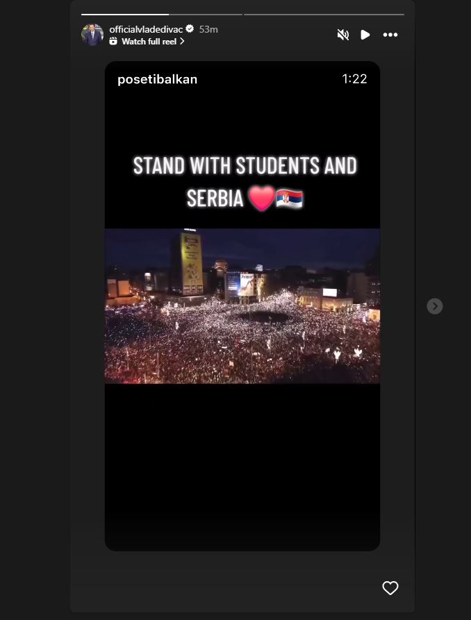 Divac je podijelio na svom instagram profilu poruke podrške studentima na engleskom kao i onu navijača Partizana da će izaći na ulice da fizički štite studente i protestante.