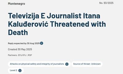 Platforma Savjeta Evrope izvijestila o prijetnjama novinarki TV E Itani Kaluđerović: Napad nivoa 2 na fizičku bezbjednost i integritet od nepoznatog izvora