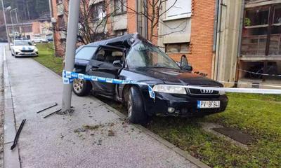 Udes kod Trgovinske škole: Auto završio na trotoaru i udario u stub, nema povrijeđenih