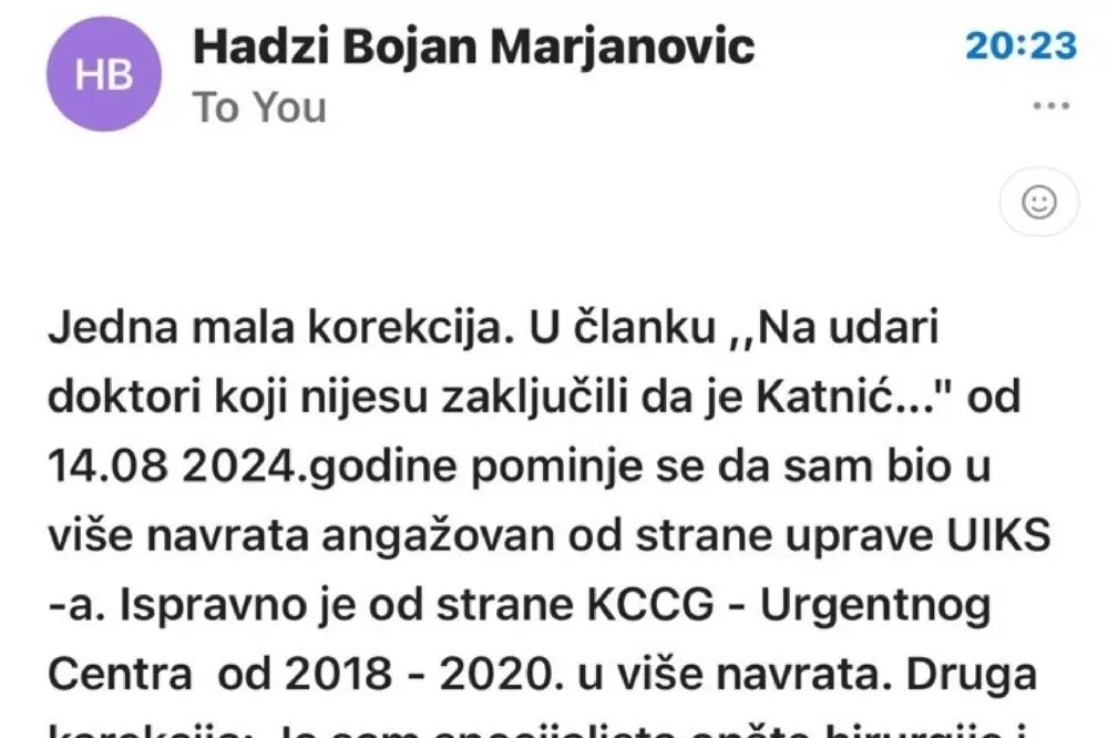Istovremeno, ljekar iz Niša je uputio, kako je napomenuo, ,,male korekcije“ o njegovoj biografiji koja je navedena u tekstu Portala ETV.