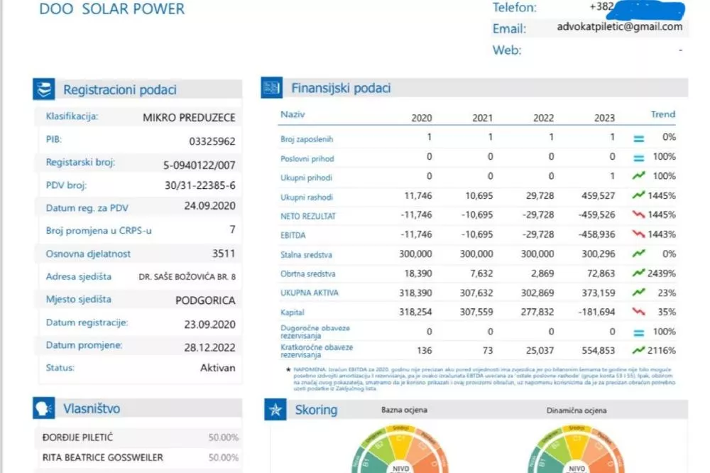 Prema istraživanju ove nevladine organizacije, Piletić ima 50 odsto vlasništva u ovoj firmi, a druga polovina pripada Riti Gosvajler (Rita Beatrice Gossweiler), koja je „Solar Power“ osnovala kao isključivi vlasnik septembra 2020. godine, sa osnovnom djelatnošću kupovine i prodaje vlastitih nekretnina i kapitalom - od jednog eura.