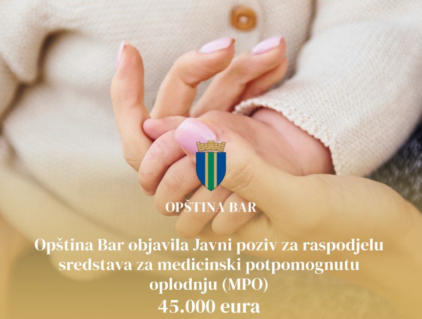 Opština Bar objavila je Javni poziv za raspodjelu sredstava za medicinski potpomognutu oplodnju (MPO) u 2025. godini kao program koji realizuju već treću godinu za redom sa ciljem pružanja podrške sugrađankama i sugrađanima da ostvare svoje snove o roditeljstvu, saopšteno je iz ove Opštine.