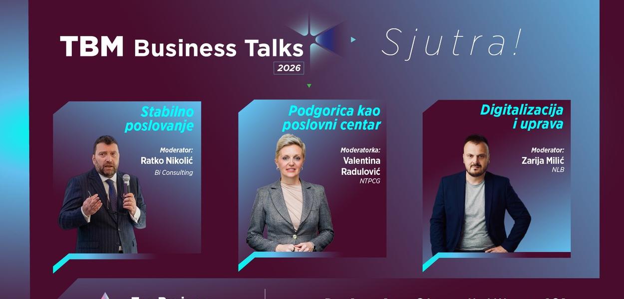 Poslovni događaj „TBM Business Talks 2026“ biće održan sjutra u Podgorici, u hotelu Hilton od 10 do 14 sati, a okupiće predstavnike institucija, finansijskog sektora i vodećih kompanija oko pitanja koja u ovom trenutku oblikuju poslovni ambijent u Crnoj Gori.