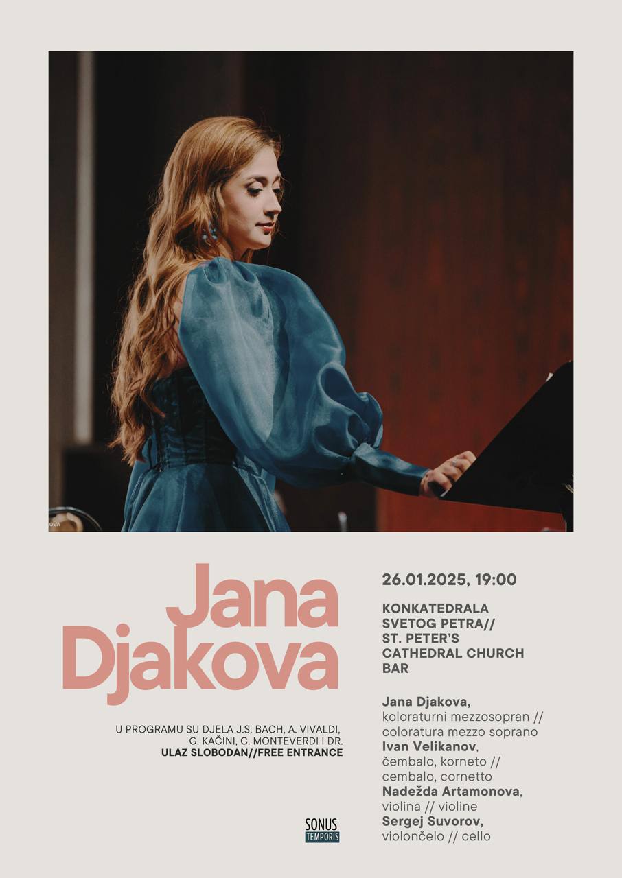 Jana Djakova, mecosopran, u pratnji Ivana Velikanova na čembalu, Nadežde Artamonove na violini i Sergeja Suvorova na violončelu, održaće jedinstveni koncert barokne muzike 26. januara u 19:00, u Konkatedrali Svetog Petra u Baru, navedeno je u saopštenju.